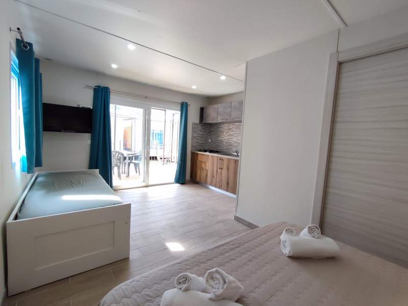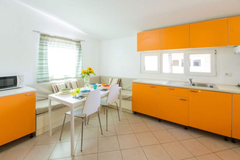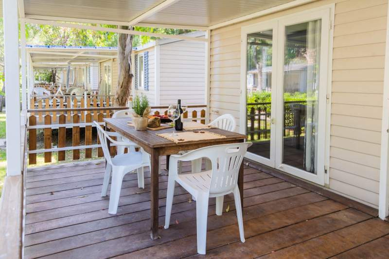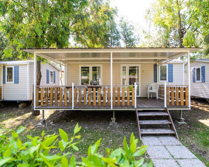 La spiaggia, premiata con Bandiera Blu, dista solo 10 minuti a piedi. Il campeggio offre bungalow moderni per 2–7 persone e piazzole attrezzate per tende, camper e roulotte.